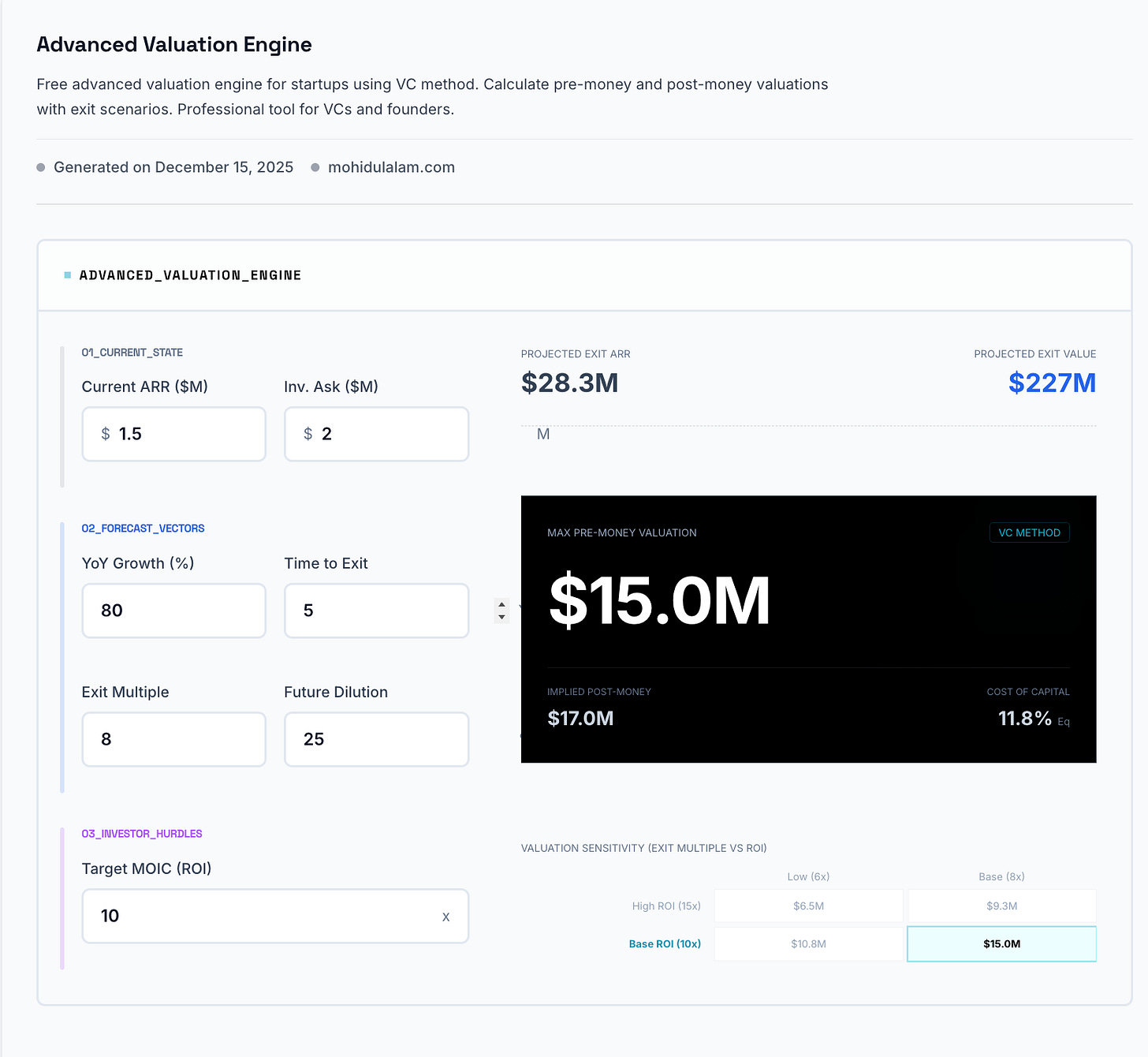 The Advanced Valuation Engine uses the Venture Capital method to calculate comprehensive startup valuations. This tool helps founders and investors determine: