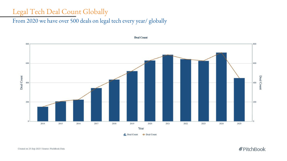That’s right. Every single year since 2020, venture capital investors have been completing more than 500 deals in the legal tech space globally. That’s more than one deal every single day.