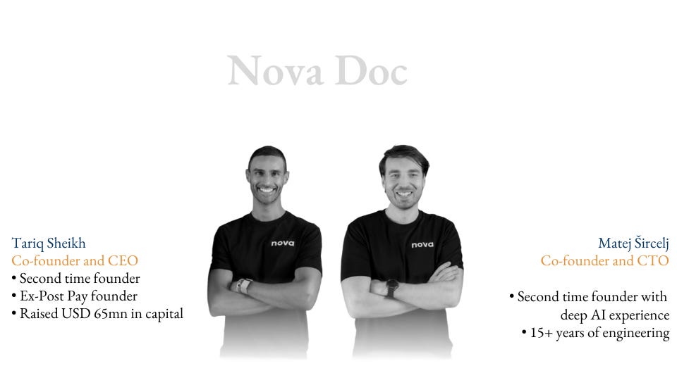 Having a CTO who’s built AI systems before and has already gone through the founder journey once gives Nova Doc a significant technical advantage.